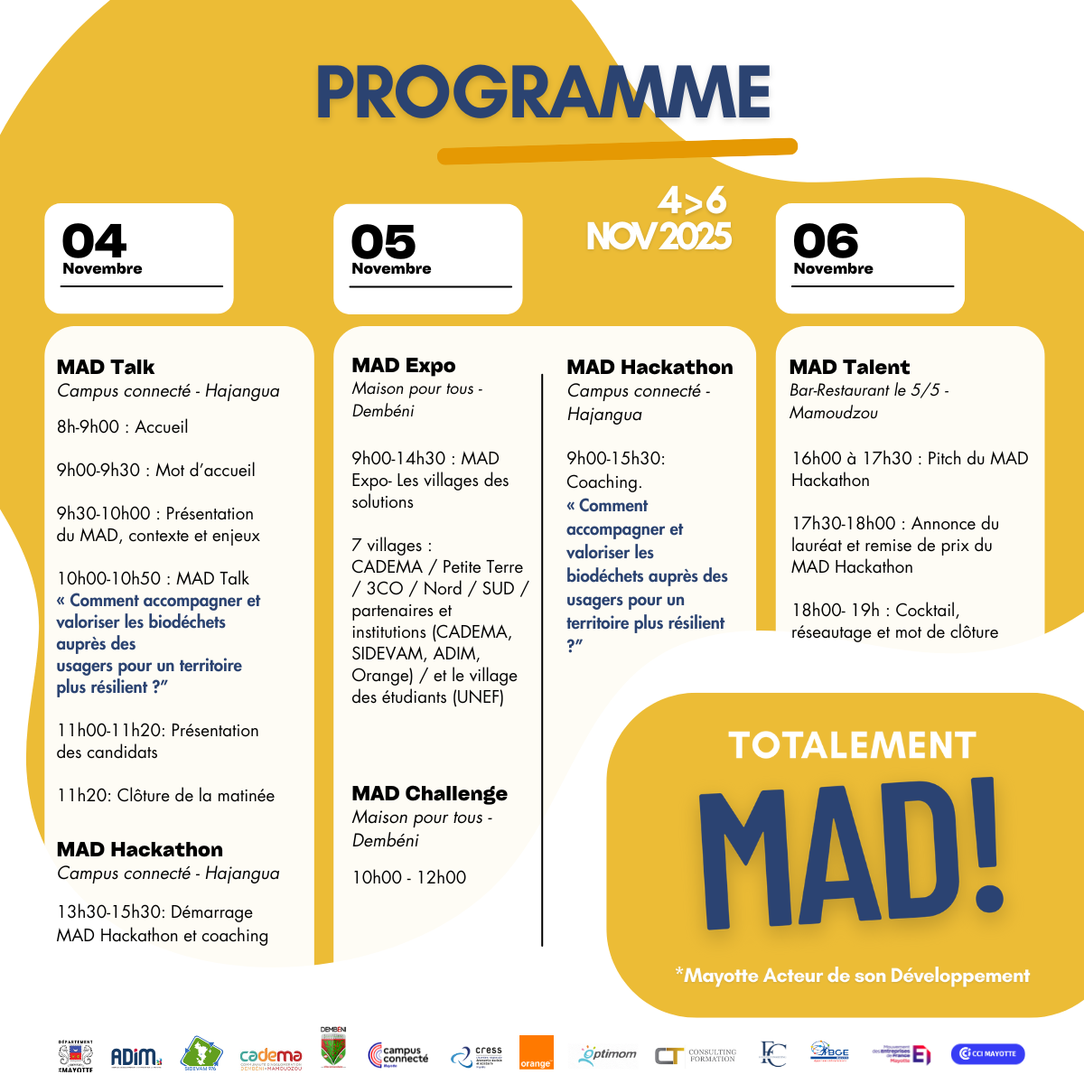 - MAD Challenge – Challenger le grand public sur sa culture générale en matière d’entrepreneuriat ainsi que sur les partenaires phares de cette année : participation sur tirage au sort le jour même à la Maison pour Tous de Dembéni, ouverte à toutes et à tous !
