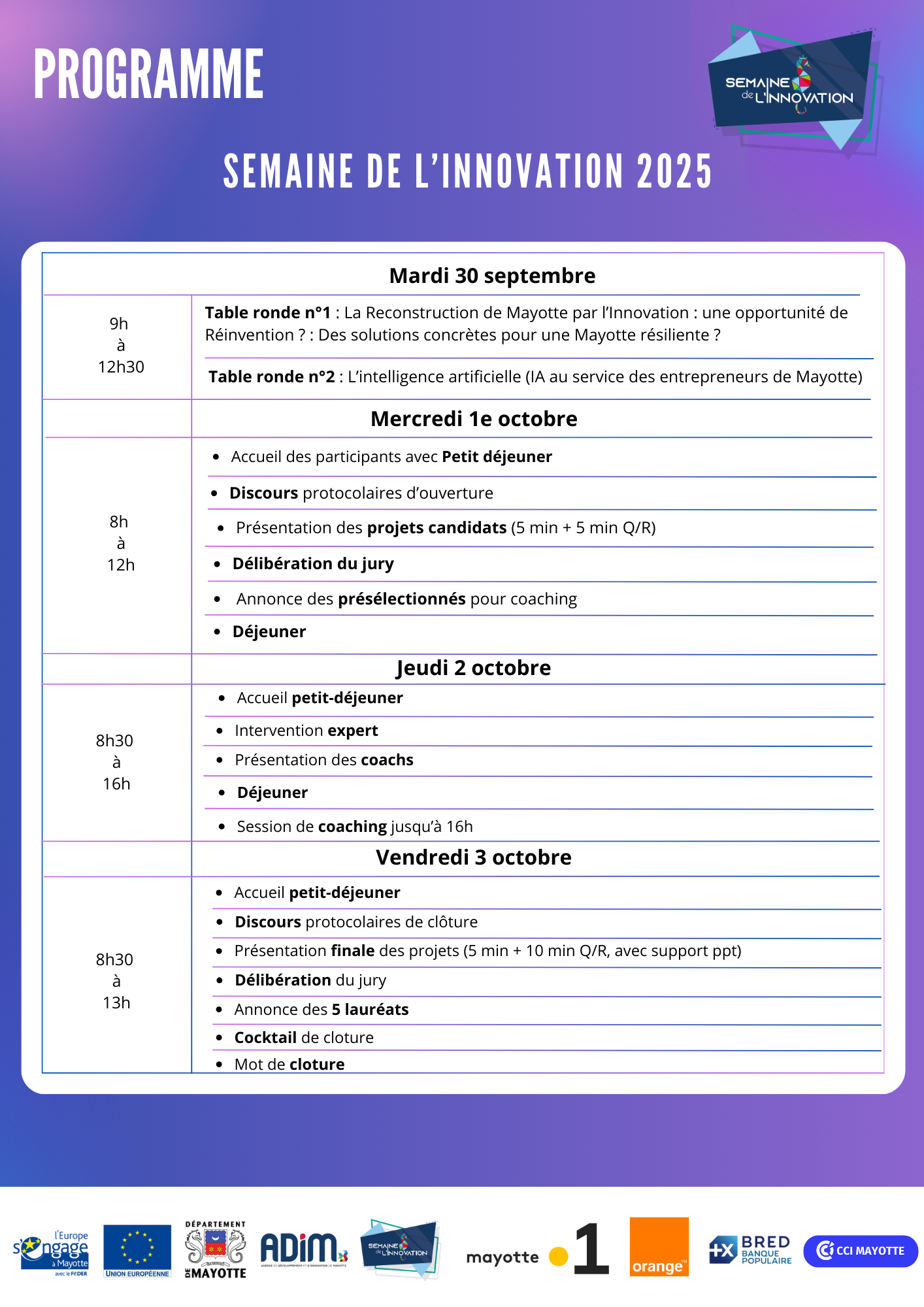 Mardi 30 septembre 2025 : Ouverture officielle de l’événement avec des discours institutionnels suivis de deux grandes tables rondes. La première portera sur la reconstruction de Mayotte par l’innovation, et la seconde explorera les opportunités offertes par l’intelligence artificielle pour les entrepreneurs. L’après-midi sera consacré à des visites de sites innovants.